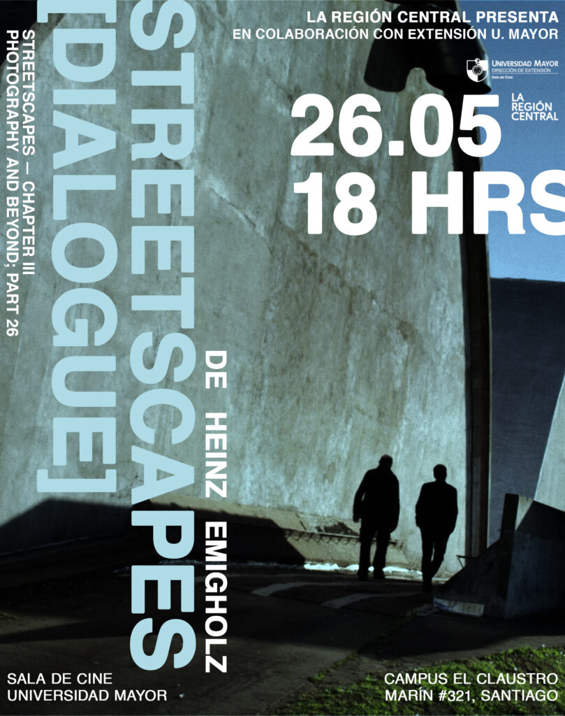 Streetscapes [Dialogue] fue realizada por Heinz Emigholz. Filmada en múltiples locaciones en Uruguay. fue filmada en 2015 y finalizada en 2017. estrenada en 2017, Cuenta con una duración de 133 minutos. La función de exhibición se llevó a cabo en la sala de cine del campus El Claustro, en la Universidad Mayor, Santiago de Chile.